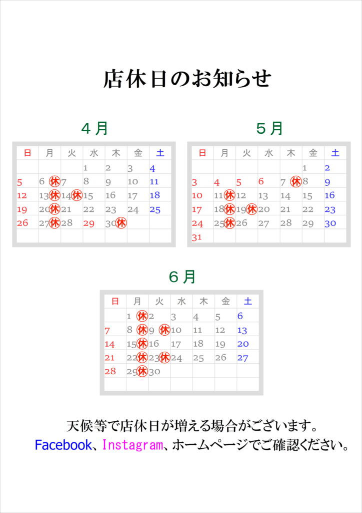 4月~6月の店休日のお知らせ